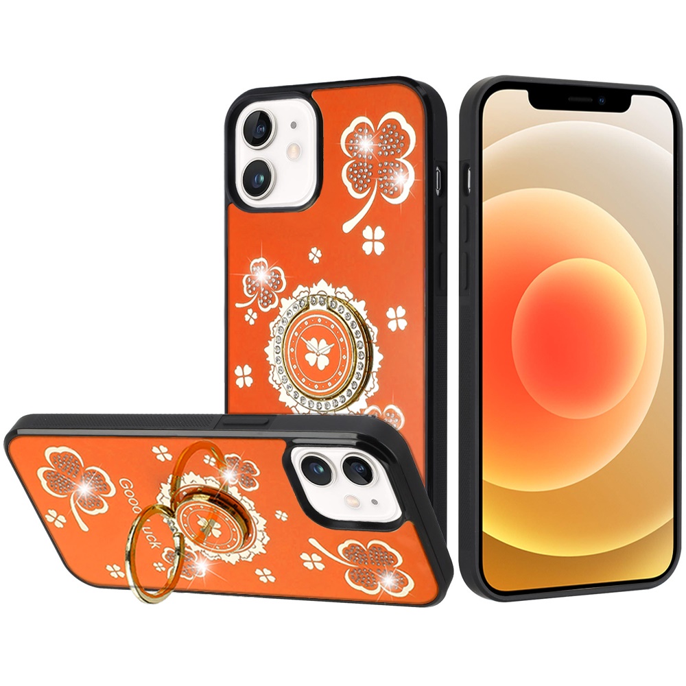 For iPhone 12 & iPhone 12 Pro SPLENDID Diamond Glitter Ornaments Engraving Case Cover - Good Luck Floral Cosmic Orange