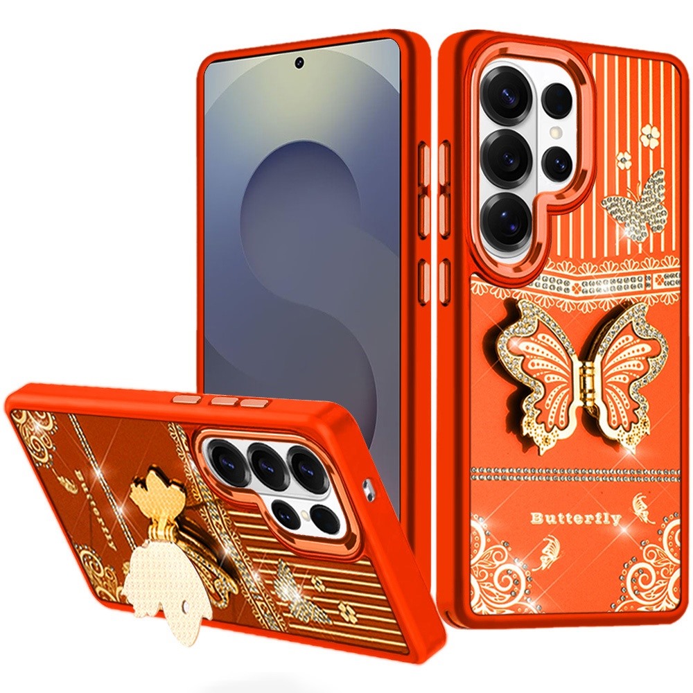 For Samsung s25 Ultra Splendid Glitter Butterfly Design Stand with Metallic Edges Hybrid Case - Cosmic Orange