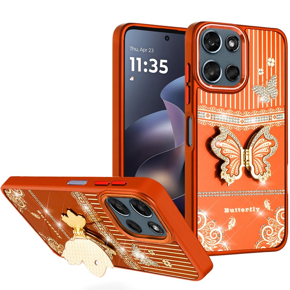For Motorola Moto G 5G 2025 Splendid Glitter Butterfly Design Stand with Metallic Edges Hybrid Case - Cosmic Orange