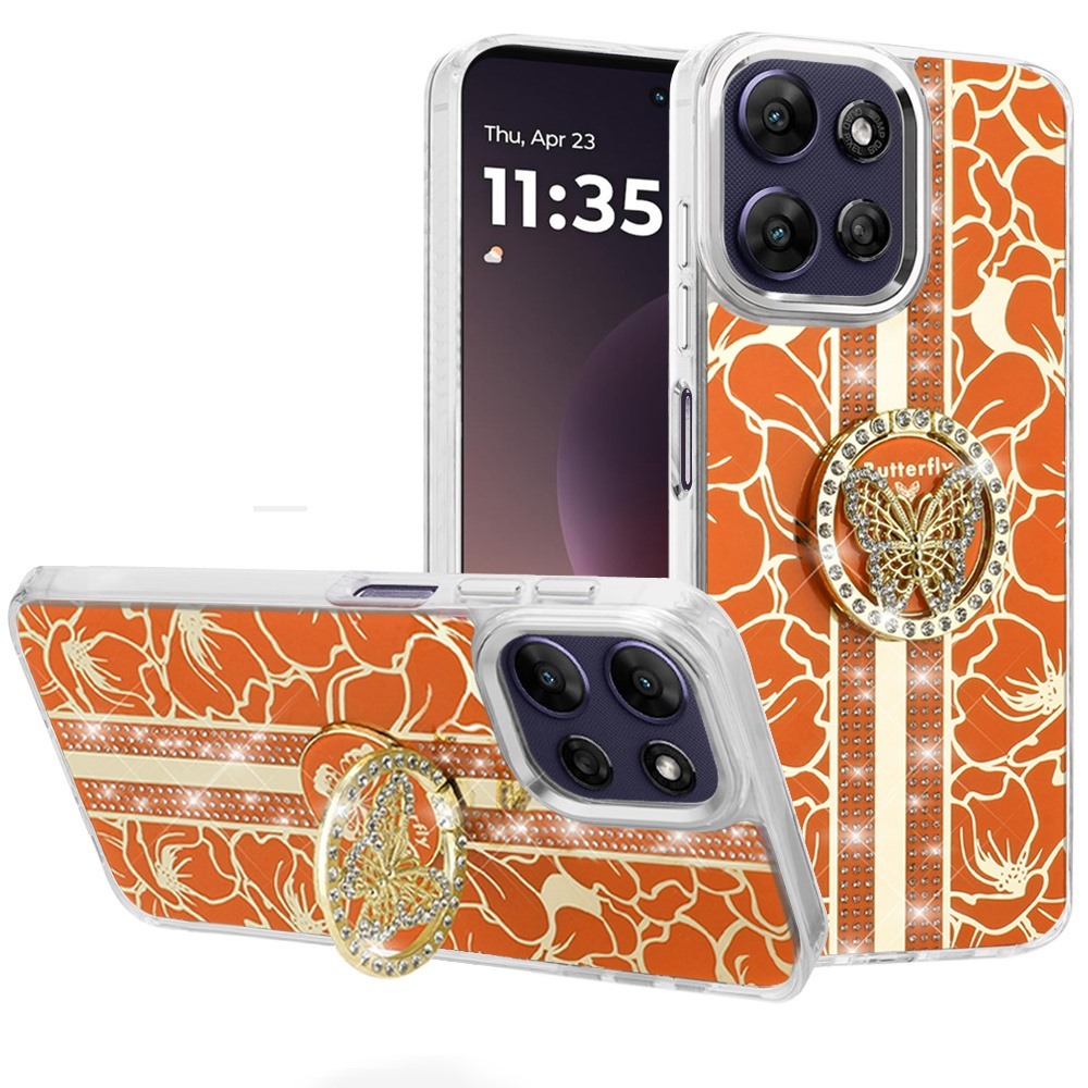 For Motorola Moto G Power 5G 2025 Splendid Floral Designs with Metal Camera and Buttons with Butterfly Ring Stand Hybrid Case - Cosmic Orange