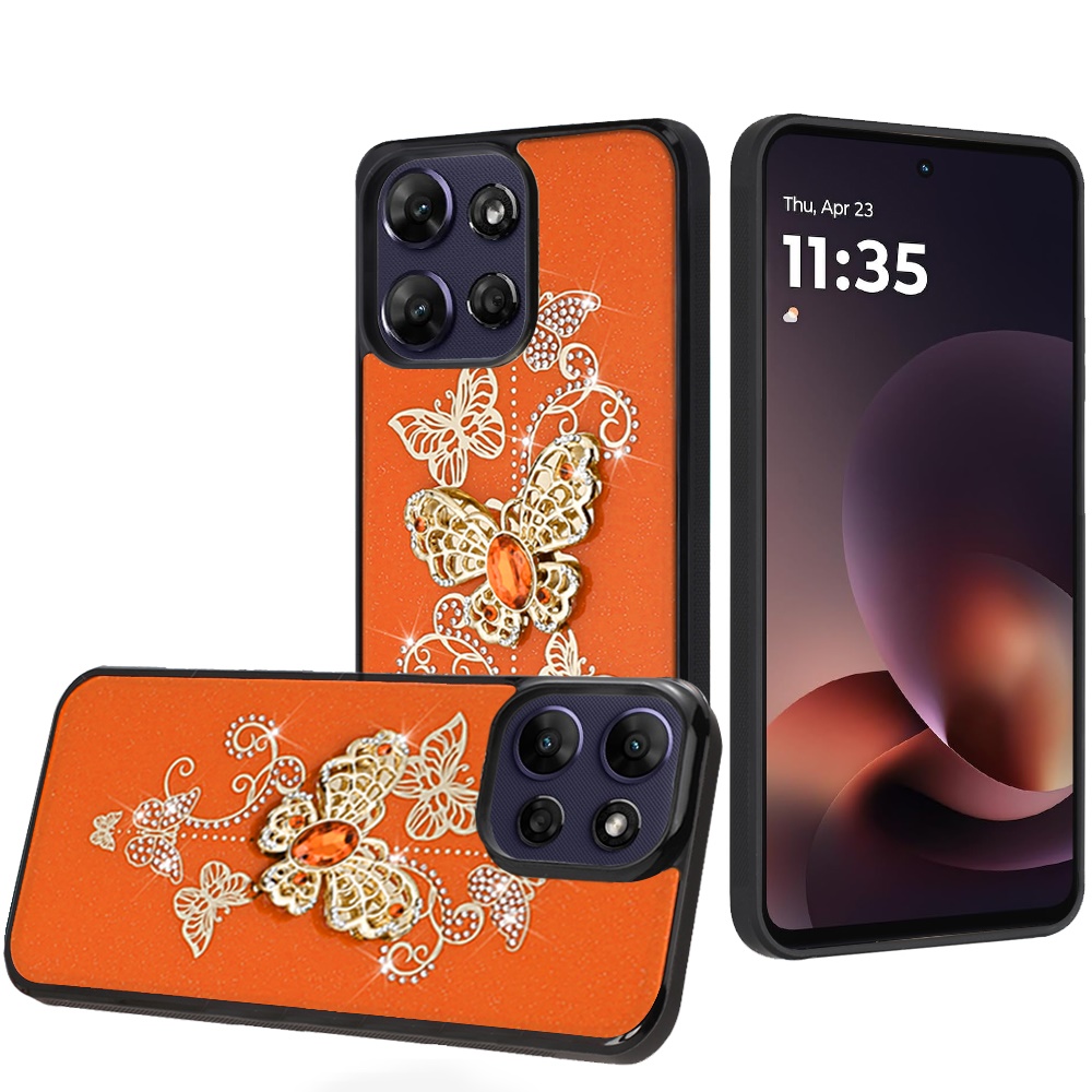 For Motorola Moto G Power 5G 2025 SPLENDID Diamond Glitter Ornaments Engraving Case Cover - Garden Butterflies Cosmic Orange