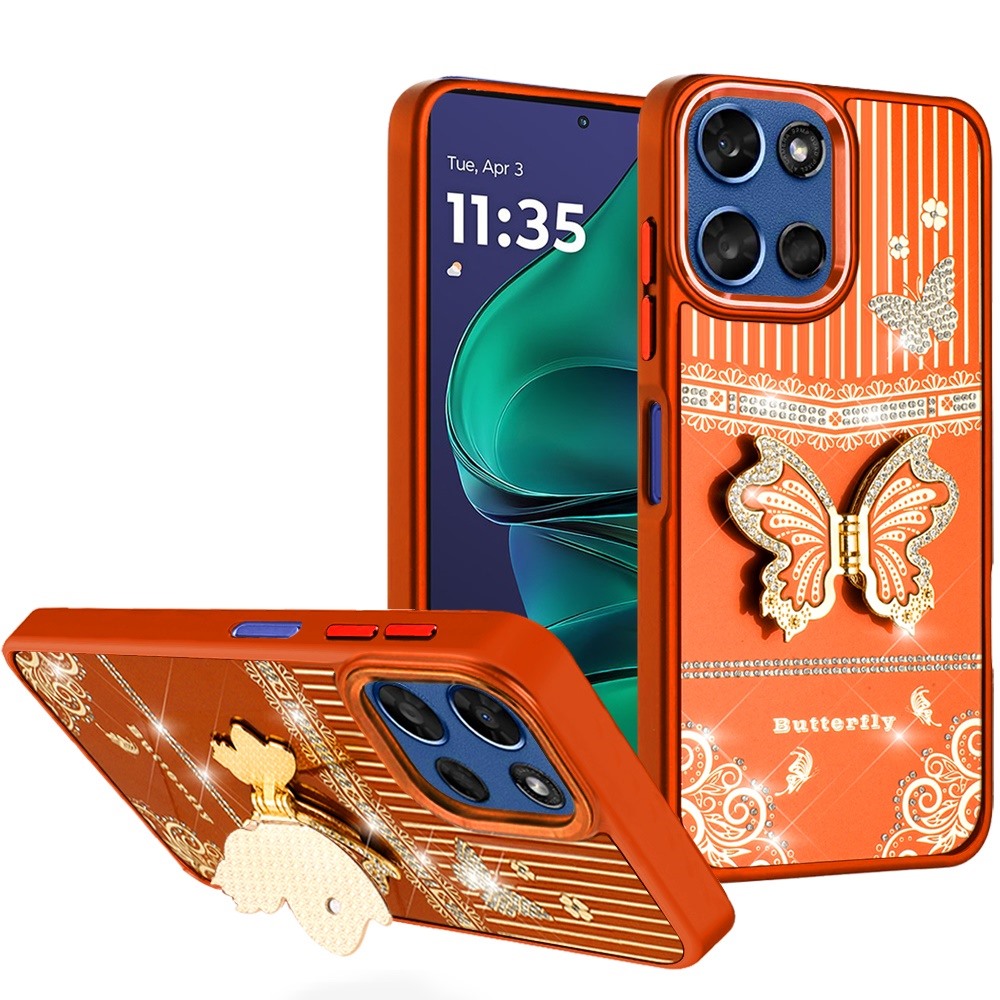 For Moto G Stylus 5G 2025 Splendid Glitter Butterfly Design Stand with Metallic Edges Hybrid Case - Cosmic Orange