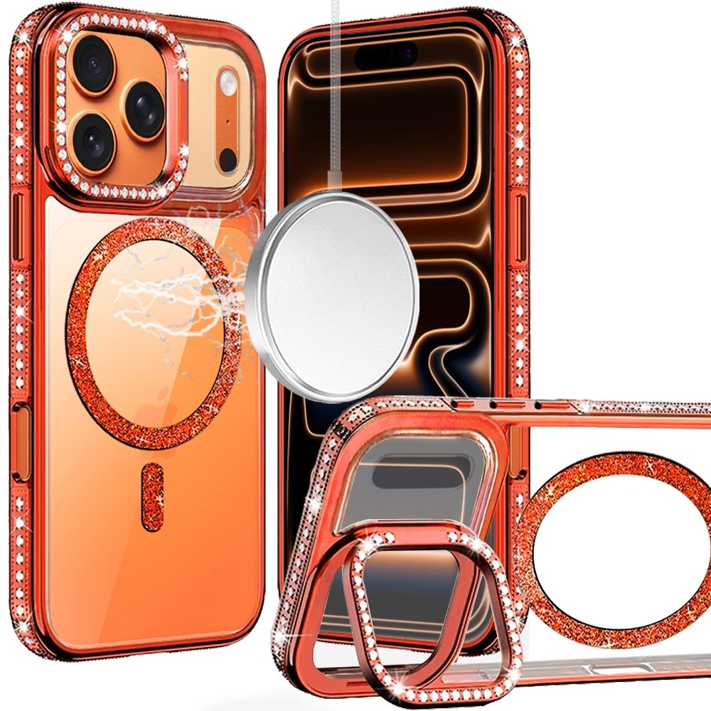 For iPhone 17 Pro Luxury Diamond Edged Magnetic Glitter Circle Hybrid with Camera Stand - Orange