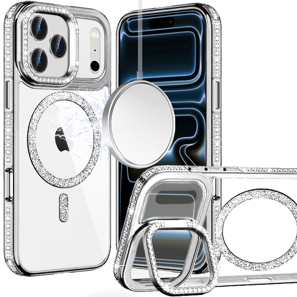 For iPhone 17 Pro Max Luxury Diamond Edged Magnetic Glitter Circle Hybrid with Camera Stand - Silver