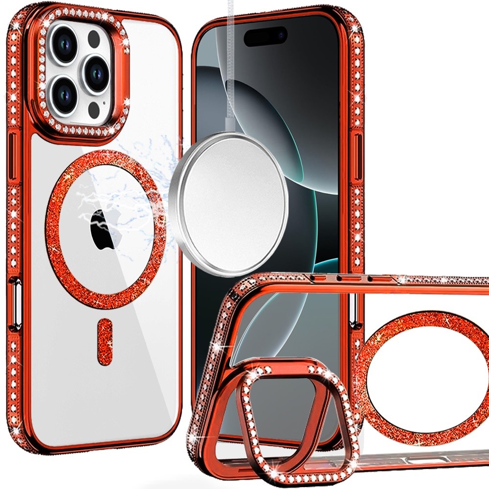 For iPhone 16 Pro Max 6.9 Luxury Diamond Edged Magnetic Glitter Circle Hybrid with Camera Stand - Orange