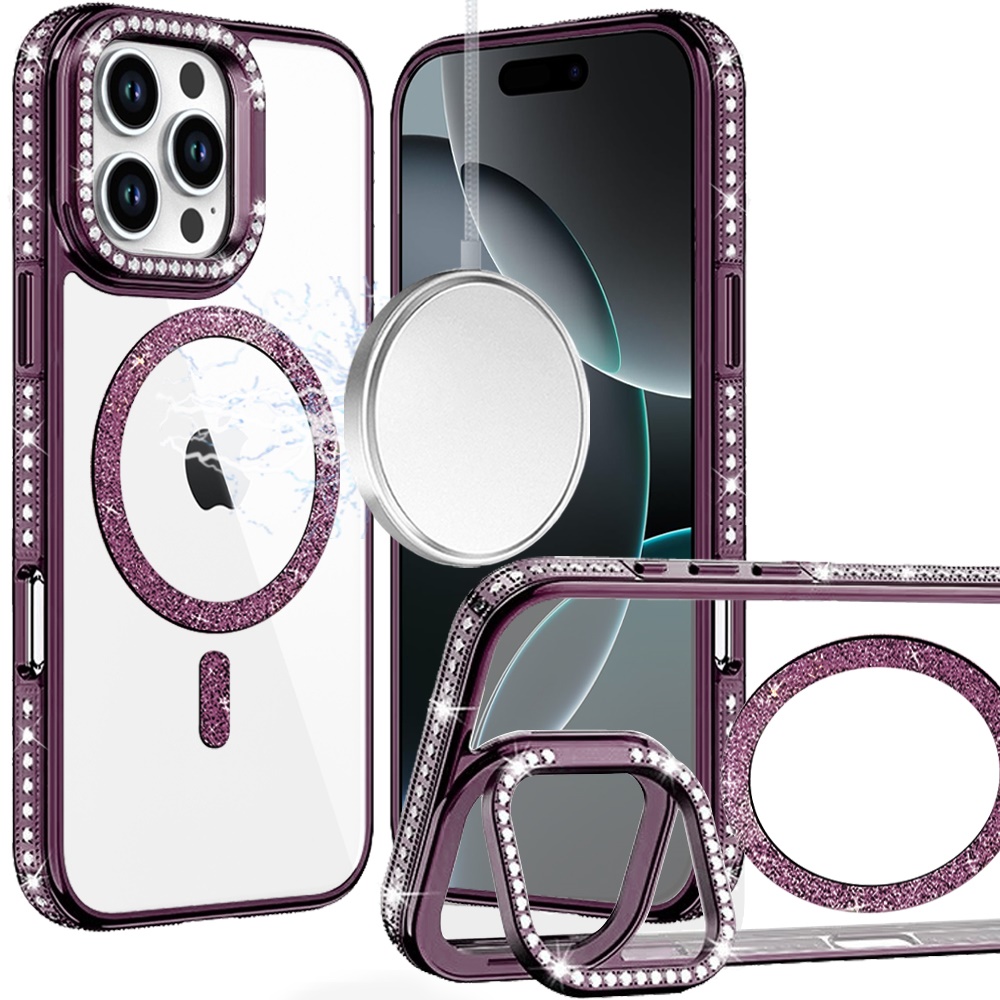 For iPhone 16 Pro Max 6.9 Luxury Diamond Edged Magnetic Glitter Circle Hybrid with Camera Stand - Dark Purple