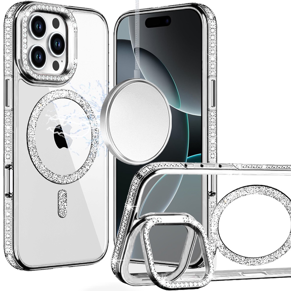 For iPhone 16 Pro Max 6.9 Luxury Diamond Edged Magnetic Glitter Circle Hybrid with Camera Stand - Silver