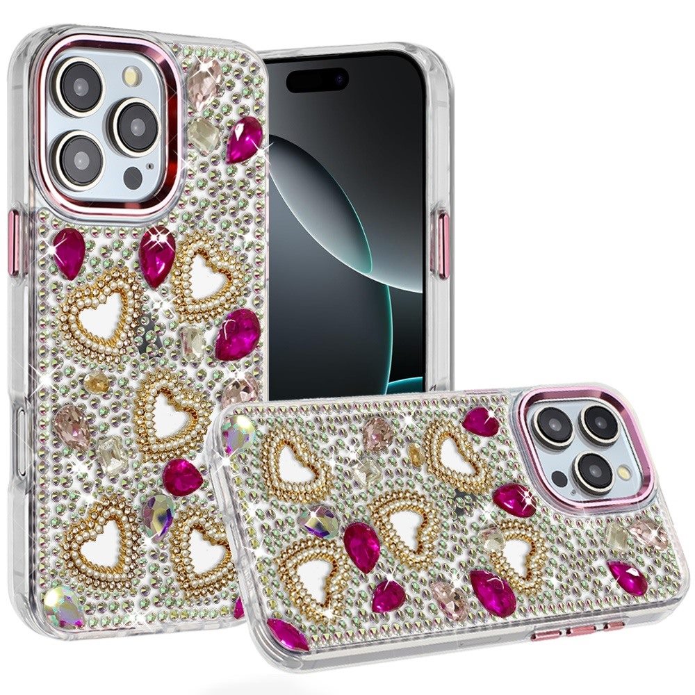 For iPhone 16 Pro Max 6.9 Luxury Crystal Heart Rhinestones Diamond Bling Hybrid Case - Hot Pink
