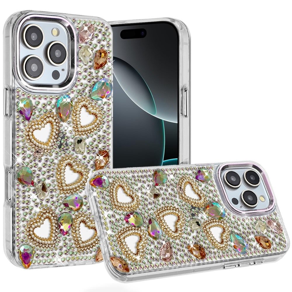 For iPhone 16 Pro Max 6.9 Luxury Crystal Heart Rhinestones Diamond Bling Hybrid Case - Multicolor
