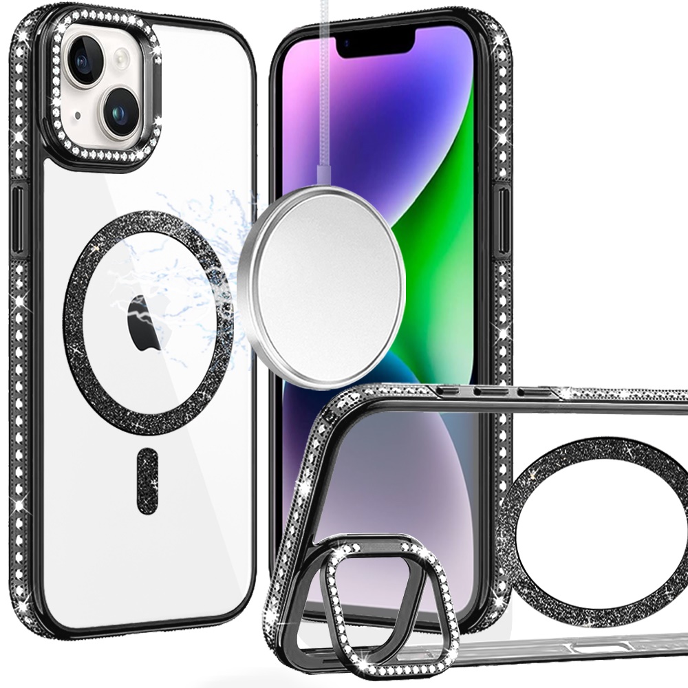 For iPhone 13/14 Luxury Diamond Edged Magnetic Glitter Circle Hybrid with Camera Stand - Black