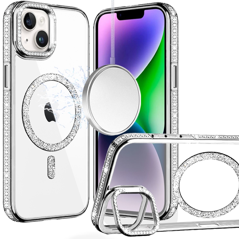 For iPhone 13/14 Luxury Diamond Edged Magnetic Glitter Circle Hybrid with Camera Stand - Silver