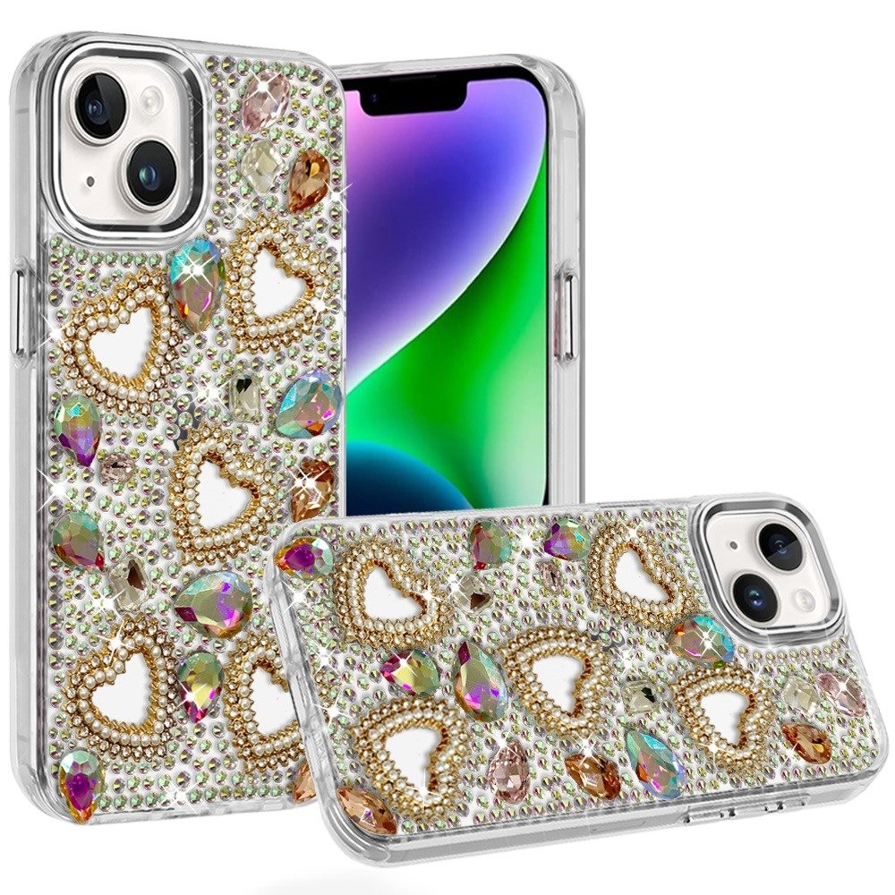 For iPhone 13/14 Luxury Crystal Heart Rhinestones Diamond Bling Hybrid Case - Multicolor