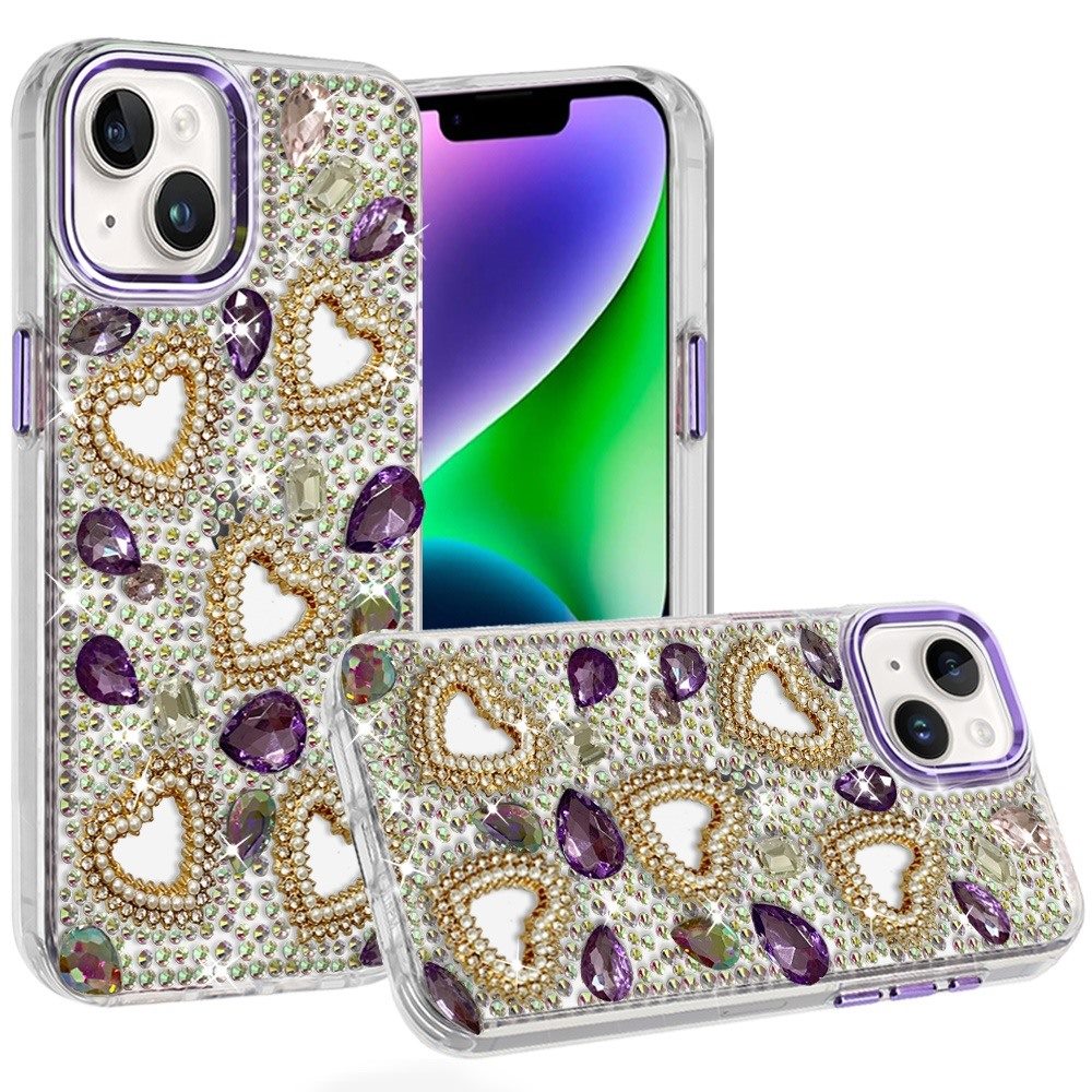 For iPhone 13/14 Luxury Crystal Heart Rhinestones Diamond Bling Hybrid Case - Dark Purple