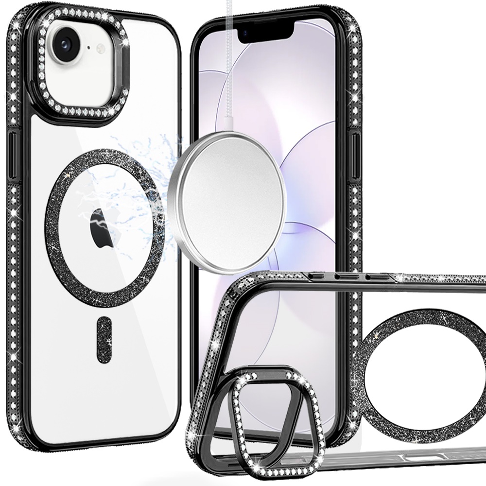 For iPhone 16E (E edition) / SE4 (2025) Luxury Diamond Edged Magnetic Glitter Circle Hybrid with Camera Stand - Black