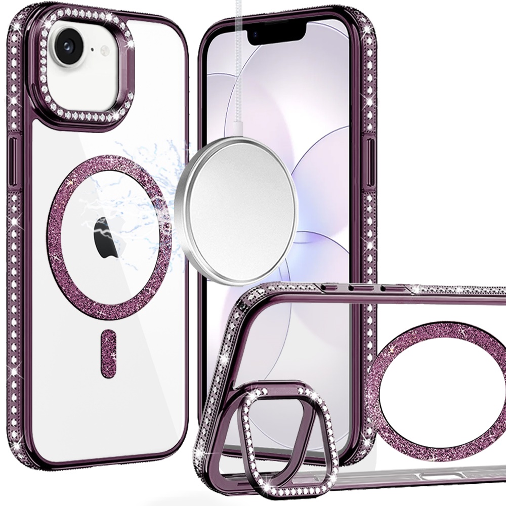 For iPhone 16E (E edition) / SE4 (2025) Luxury Diamond Edged Magnetic Glitter Circle Hybrid with Camera Stand - Dark Purple