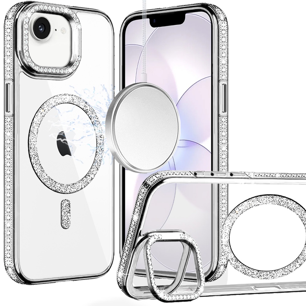 For iPhone 16E (E edition) / SE4 (2025) Luxury Diamond Edged Magnetic Glitter Circle Hybrid with Camera Stand - Silver