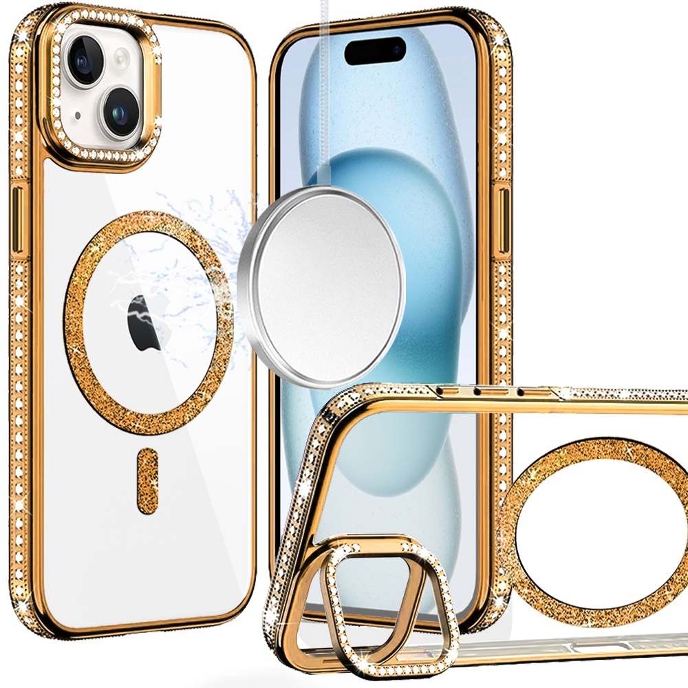 For iPhone 15 Luxury Diamond Edged Magnetic Glitter Circle Hybrid with Camera Stand - Gold