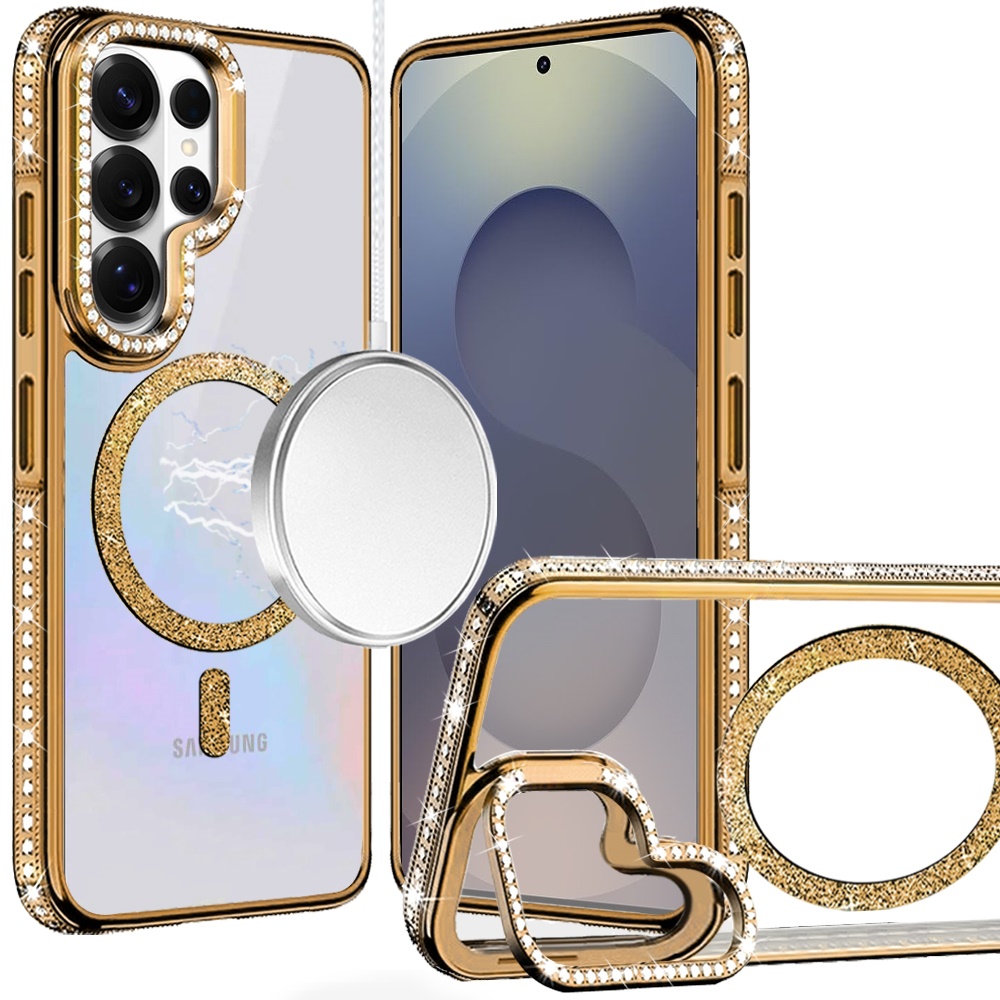 For Samsung s25 Ultra Luxury Diamond Edged Magnetic Glitter Circle Hybrid with Camera Stand - Gold