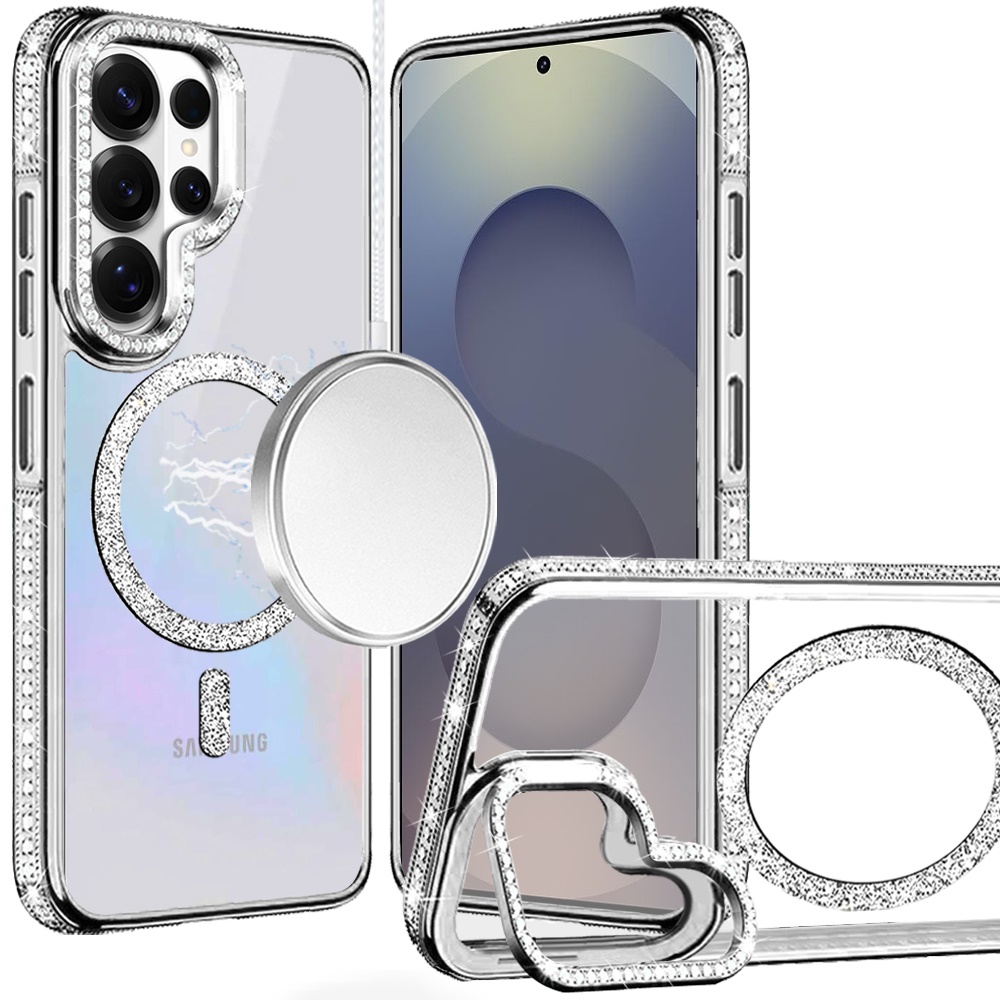 For Samsung s25 Ultra Luxury Diamond Edged Magnetic Glitter Circle Hybrid with Camera Stand - Silver