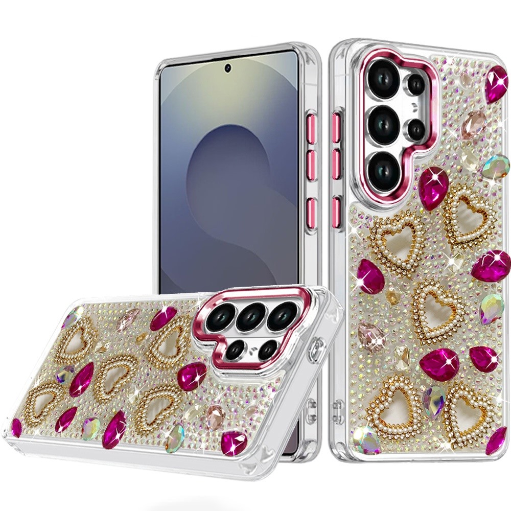 For Samsung s25 Ultra Luxury Crystal Heart Rhinestones Diamond Bling Hybrid Case - Hot Pink