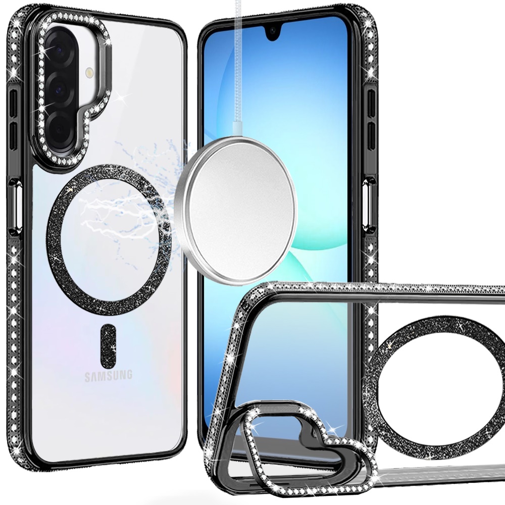 For Samsung A17 5G Luxury Diamond Edged Magnetic Glitter Circle Hybrid with Camera Stand - Black