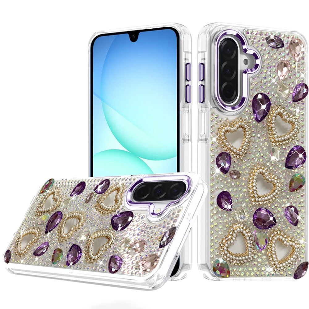 For Samsung A17 5G Luxury Crystal Heart Rhinestones Diamond Bling Hybrid Case - Dark Purple