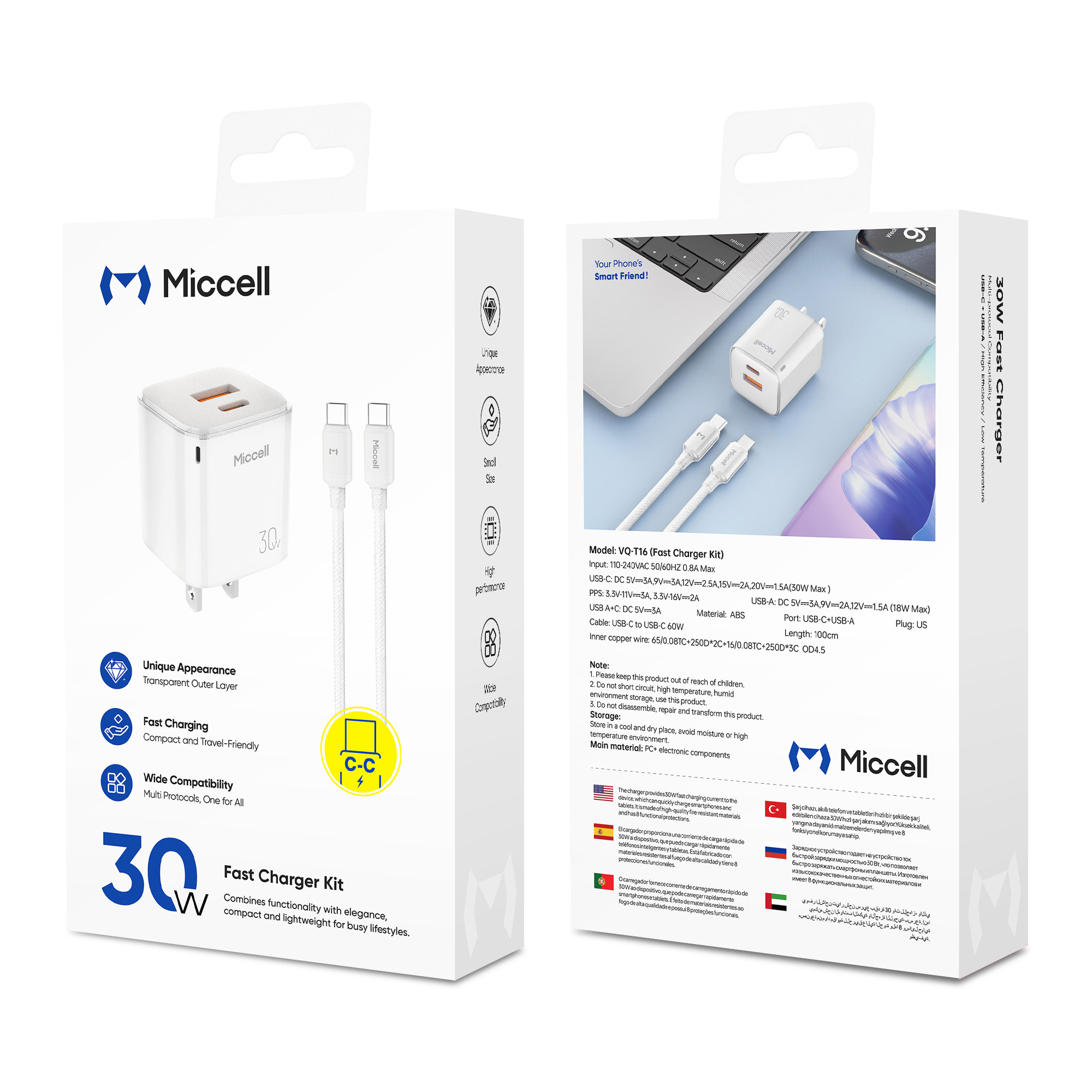 Miccell 30W Fast Wall Charger COMBO - USB-C 1X USB-A with PD and Cable 1M USB-C to USB-C - White
