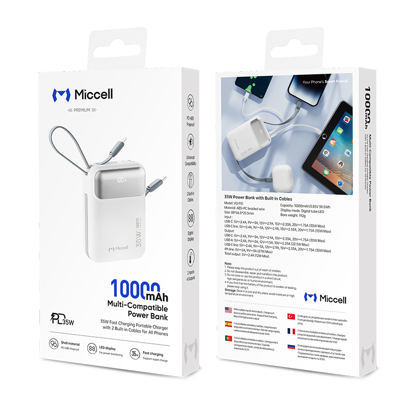 Miccell 10,000 mAh 35W PD Powerbank with attached USB-C Cable - White