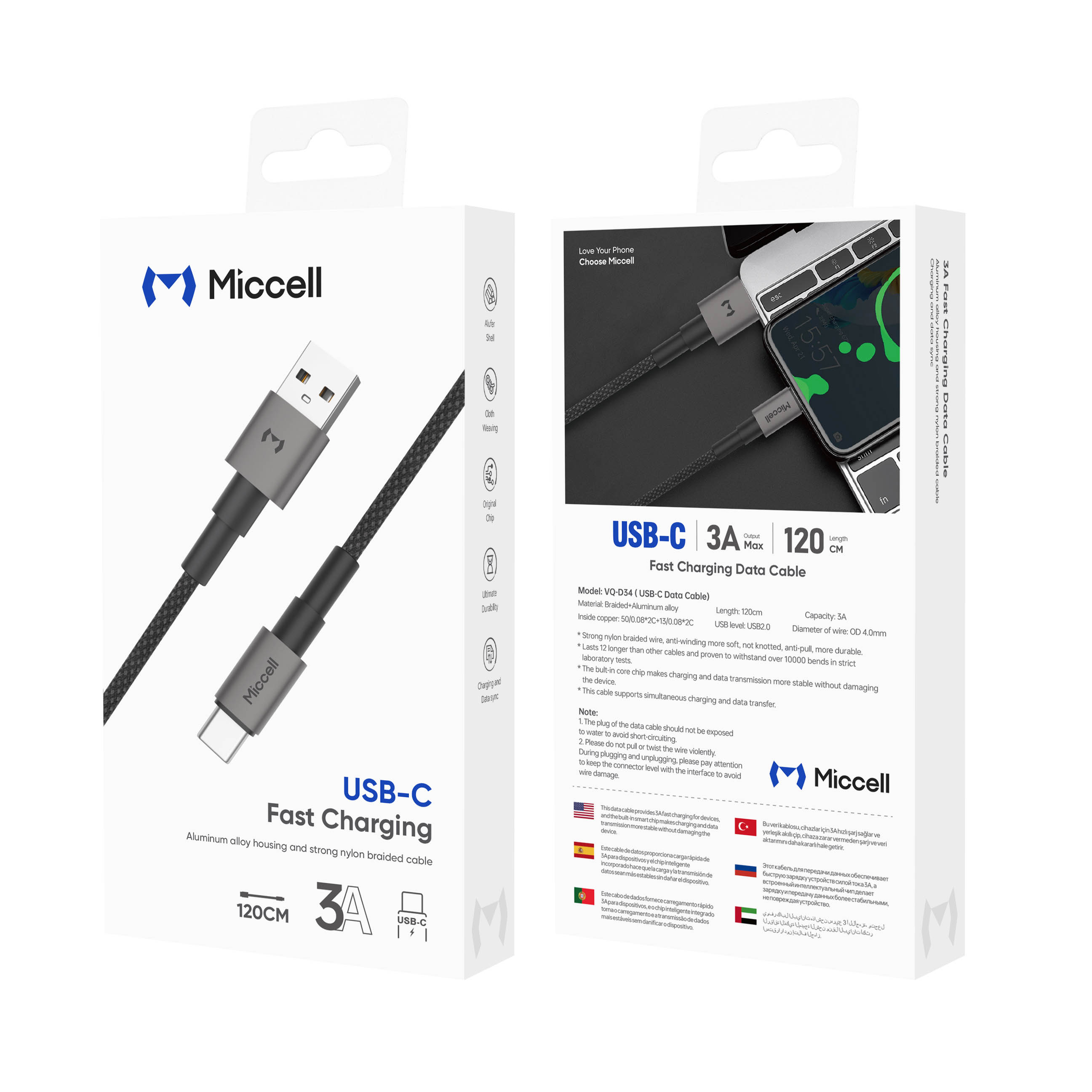 Miccell 4FT FAST 12.M USB-A to USB-C Charging Braided Cable - Black