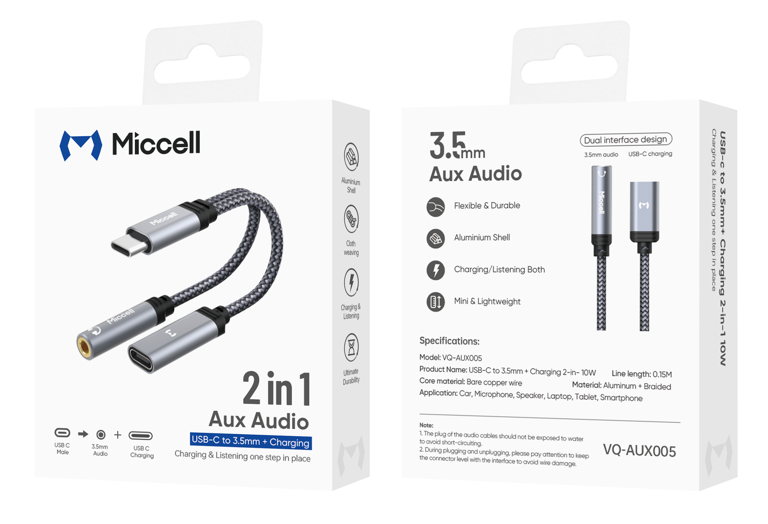 Miccell 10W USB-C to 3.5mm Female + USB-C Female Charging and Audio Nylon Braided Adapter - Gray