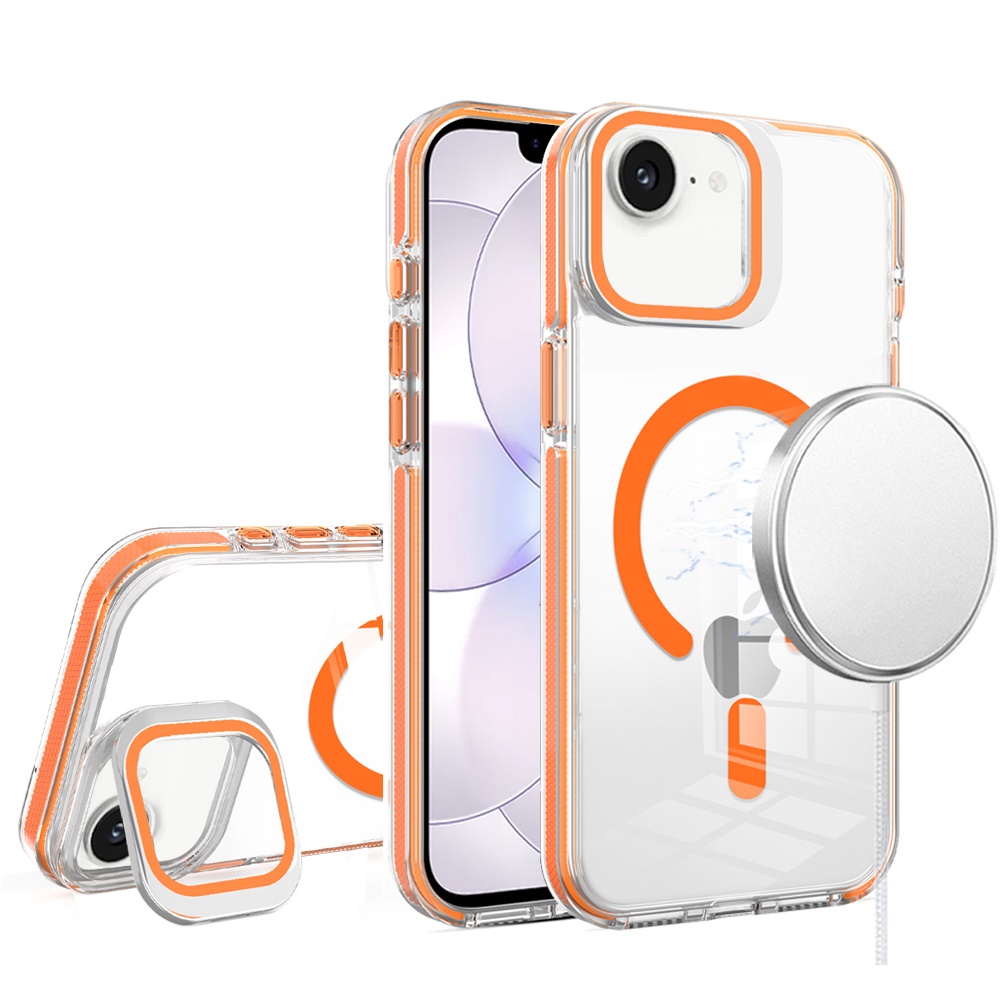 For iPhone 16E (E edition) / SE4 (2025) Camera Metallic Stand [Magnetic Circle] Transparent Colorful Matching Edged Tough Hybrid Case - Cosmic Orange