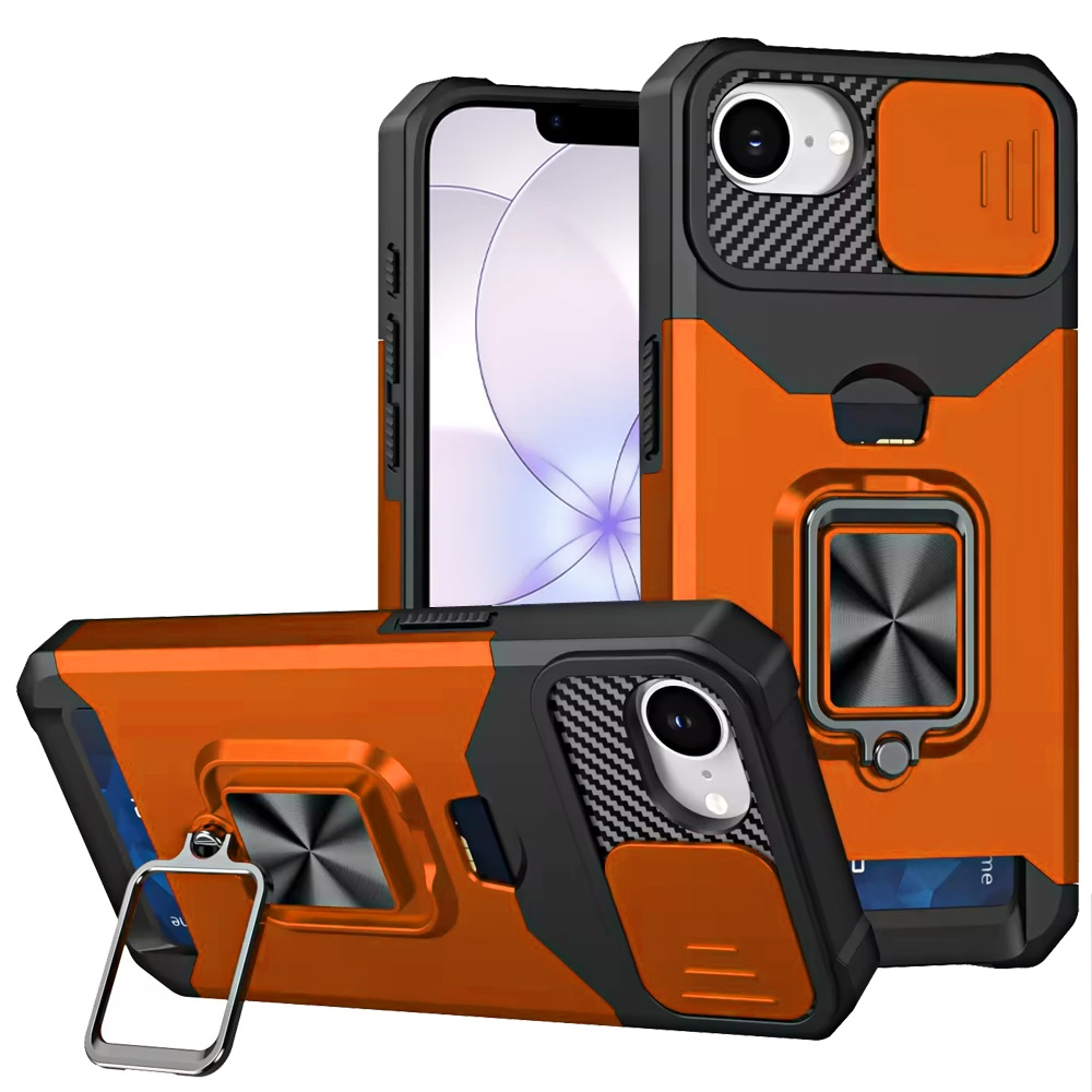 For iPhone 16E (E edition) / SE4 (2025) Multi-Functional Card Magnetic Ring Stand Hybrid Camera Case Cover - Cosmic Orange