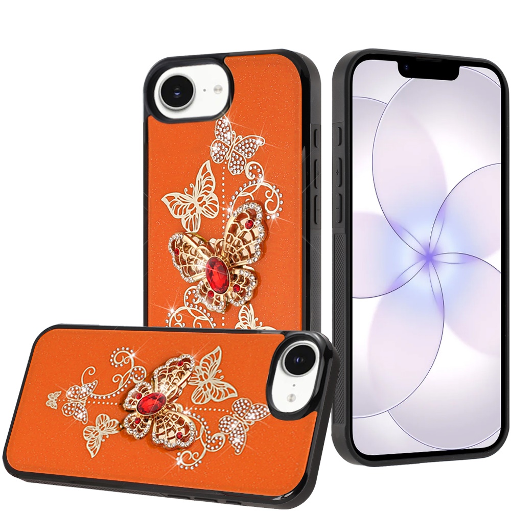 For iPhone 16E (E edition) / SE4 (2025) SPLENDID Diamond Glitter Ornaments Engraving Case Cover - Garden Butterflies Cosmic Orange