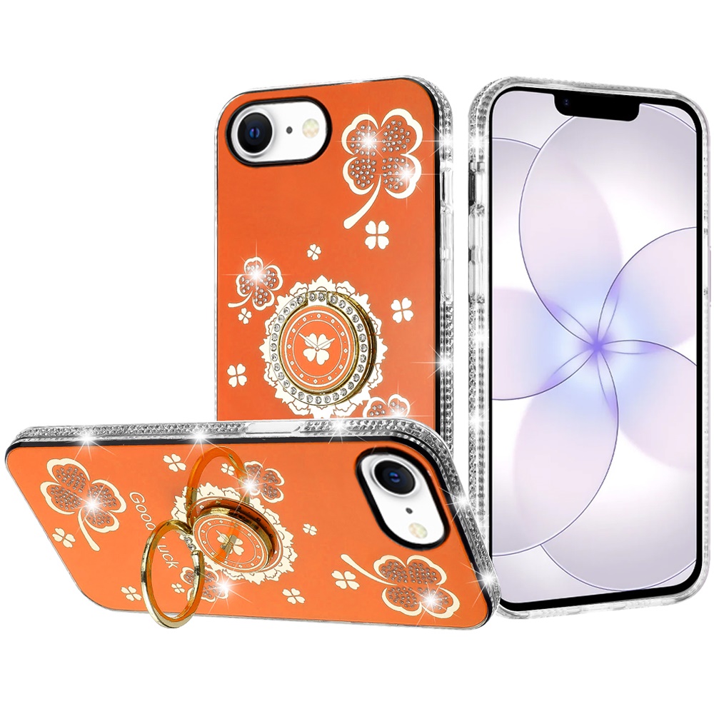 For iPhone 16E (E edition) / SE4 (2025) Splendid Glitter with Diamonds All Around Edges Ring Stand Case Cover - Cosmic Orange