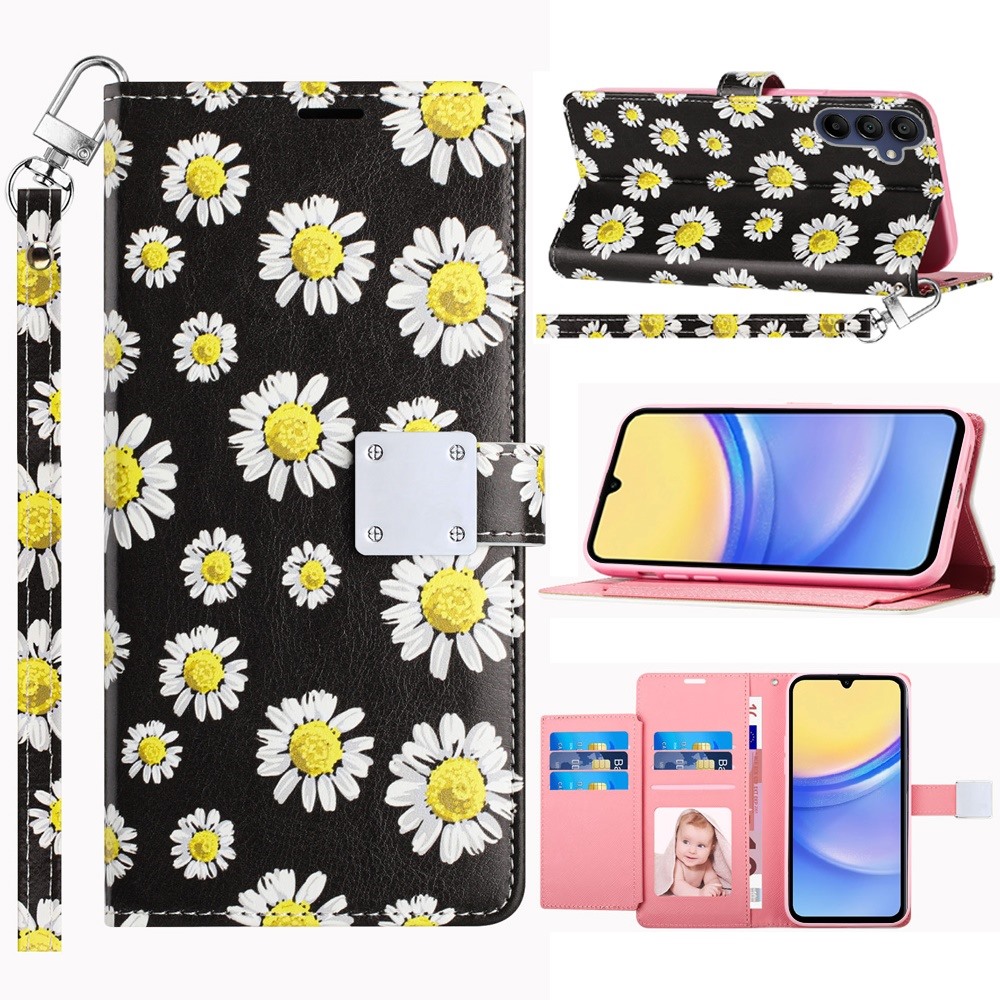 For Samsung A15 5G Design Wallet ID Credit Card Money Holder with Magnetic Metal Closure including Lanyard - White Daisy