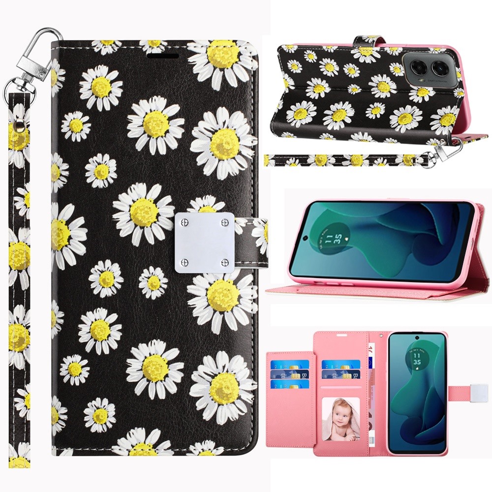 For Motorola Moto G 5G (2024) Design Wallet ID Credit Card Money Holder with Magnetic Metal Closure including Lanyard - White Daisy